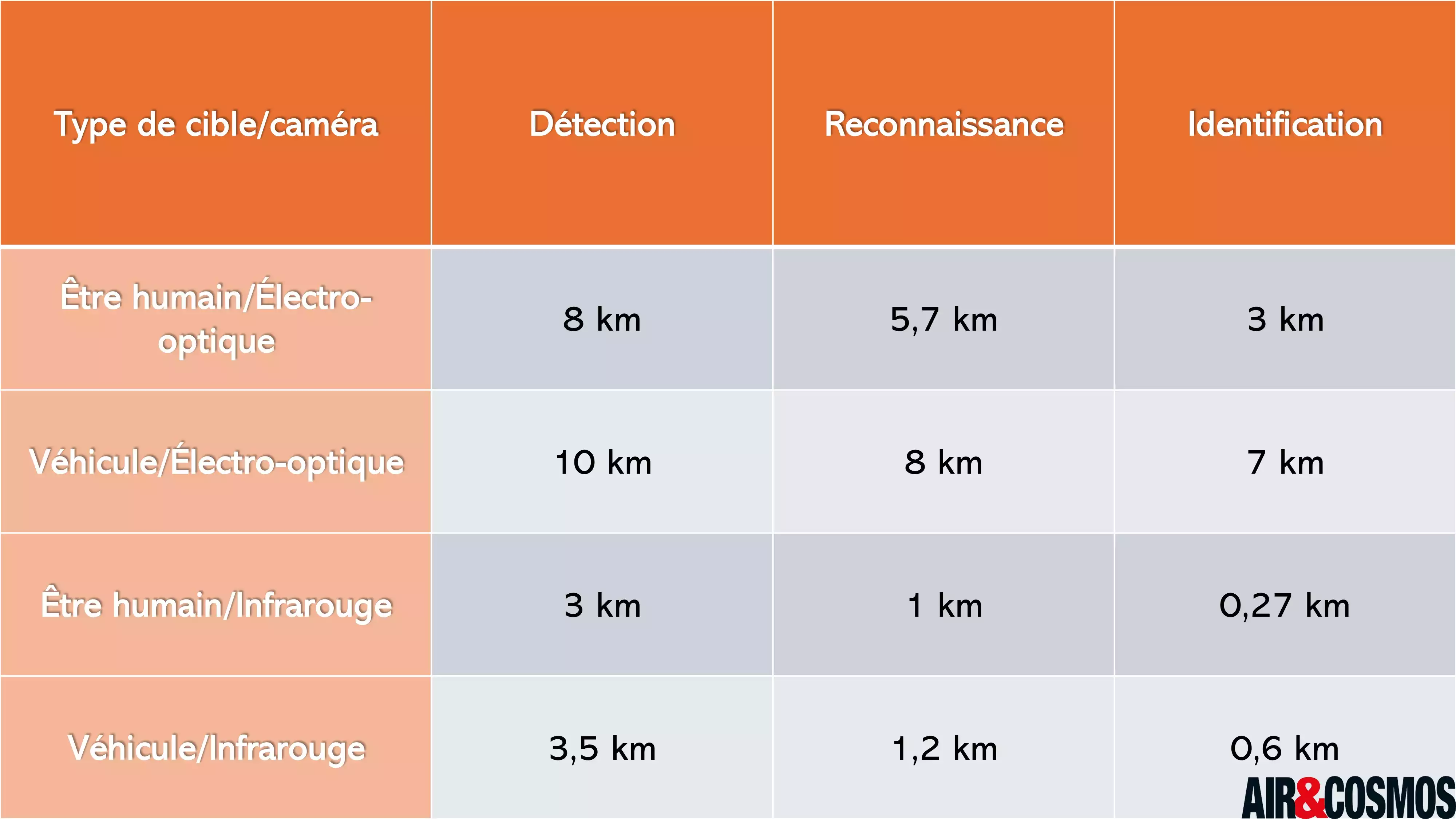 Apropos Zoom, das Video zeigt auch die Leistungsfähigkeit der elektro-optischen Kamera, wie unten in der Verschmelzung der beiden Screenshots dargestellt: Während eines Fluges kann ein Zoom auf Schiffe deutlich zeigen, dass der DT26 durchaus in der Lage ist, Fahrzeuge aus großer Entfernung zu erkennen. Die folgende Tabelle gibt auch einen Überblick über die Fähigkeiten zur Erkennung, Aufklärung und Identifizierung von Einsatzkräften oder Fahrzeugen in Abhängigkeit von der elektro-optischen oder Infrarotkamera.