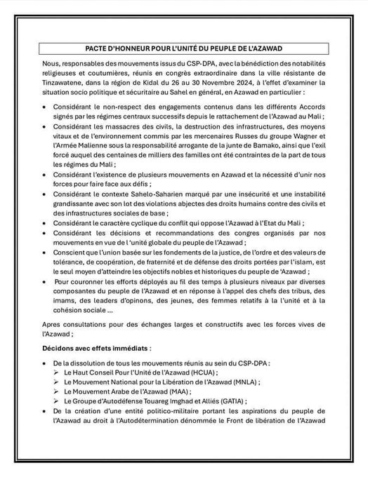[AZAWAD] Die Auflösung aller Bewegungen: Mouvement national de libération de l'Azawad ( MNLA ), Groupe d'autodéfense Imghad et Alliés ( GATIA ), Haut Conseil pour l'unité de l'Azawad (HCUA ), Mouvement Arabe de l'Azawad ( MAA ) , um eine einzige vereinte Front zu schaffen, Front de Libération de l'Azawad ( FLA ) unter einem einzigen politischen und militärischen Commandement und unter einer einzigen Flagge. Die FLA ist der einzige legitime Vertreter des Volkes von Azawad und trägt dessen Kampf der Selbstbestimmung.