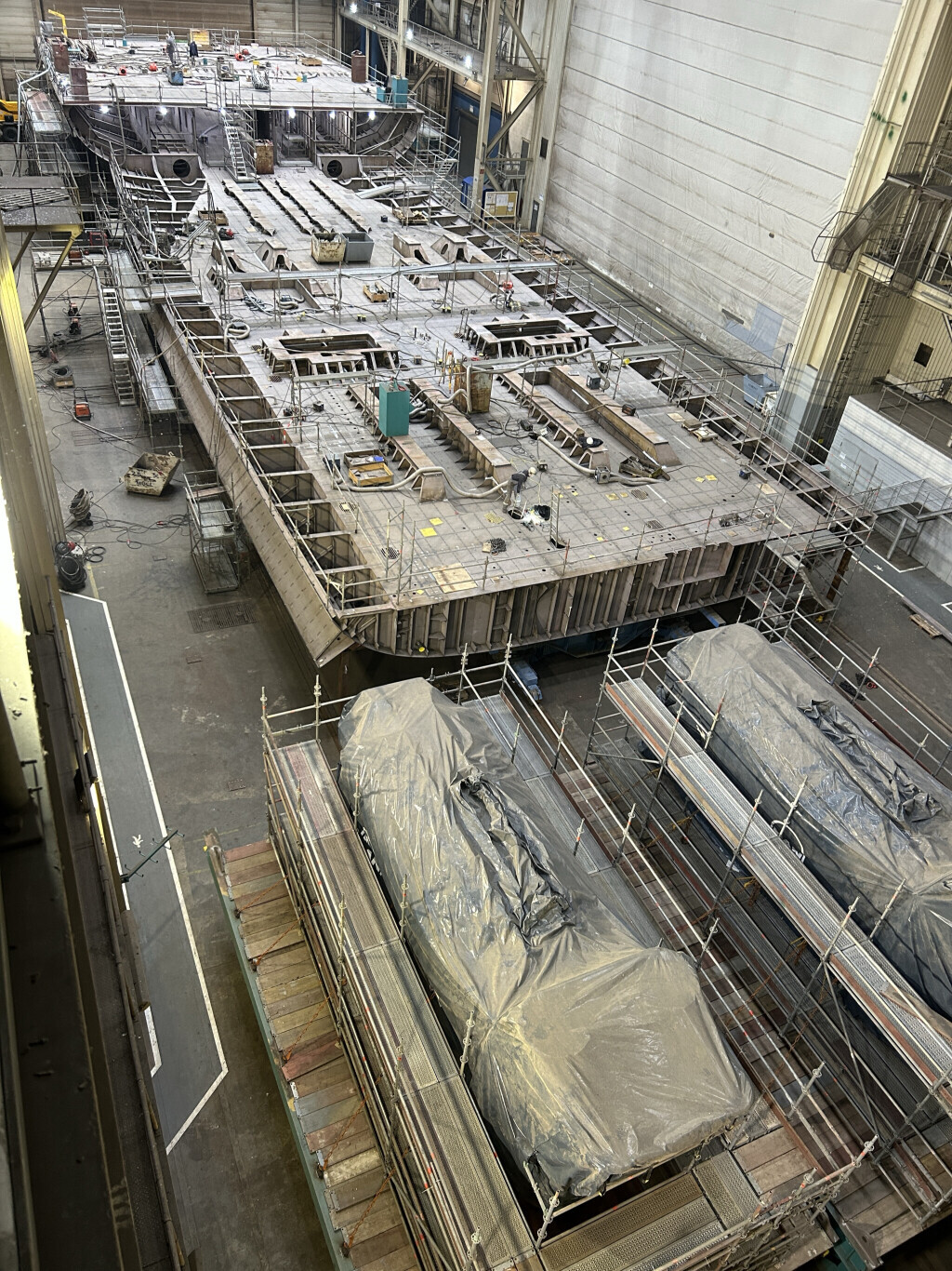 Blick in die Peene-Werft auf den Produktionsfortschritt der Fregatte F126. (NVL)