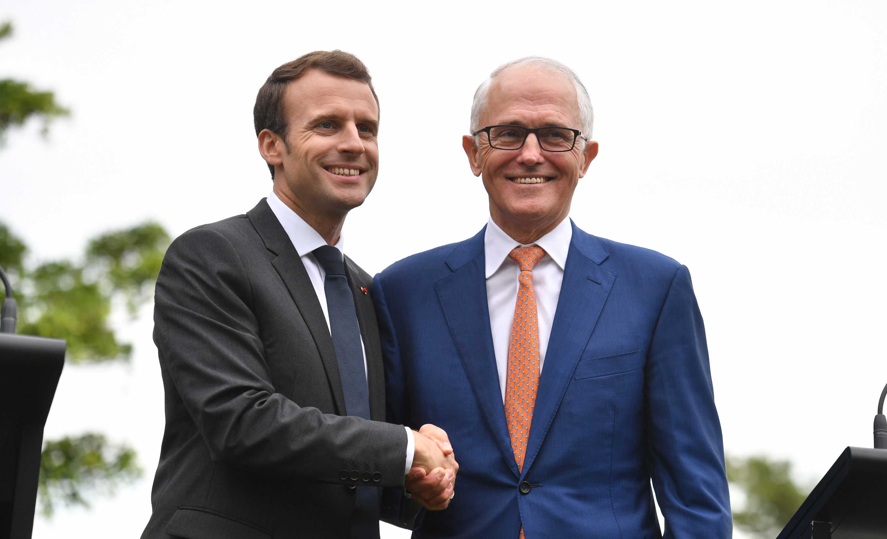 Malcolm Turnbull und Emmanuel Macron schütteln sich bei einer gemeinsamen Pressekonferenz in Sydney die Hände.