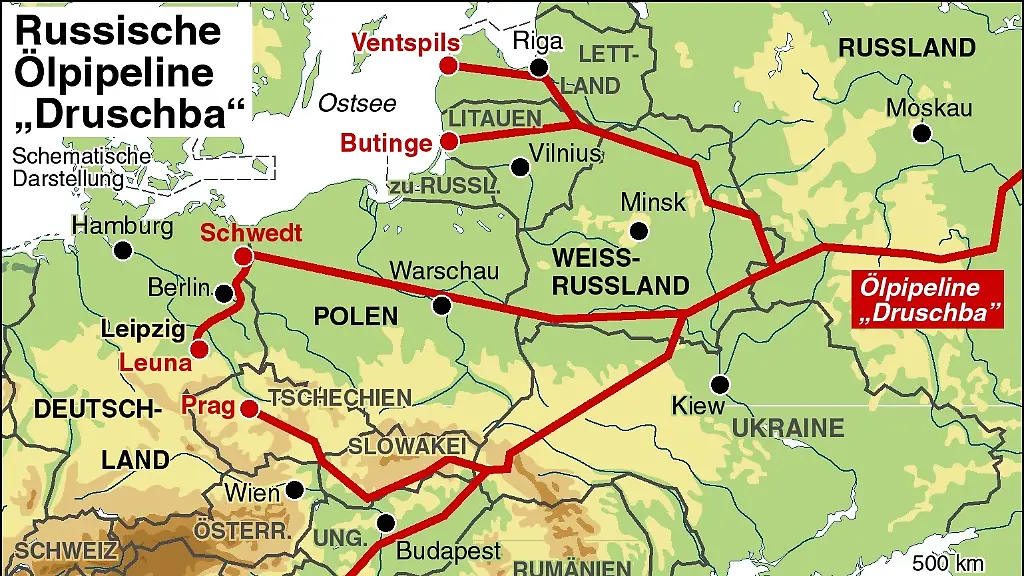 Die Druschba-Pipeline wird wohl von Russland gesperrt. Sie führt über Russland in einem Zweig über Belarus und Polen nach Schwedt und Leuna, in einem anderen Zweig über die Ukraine in die Slowakei und weiter nach Ungarn oder Tschechien.