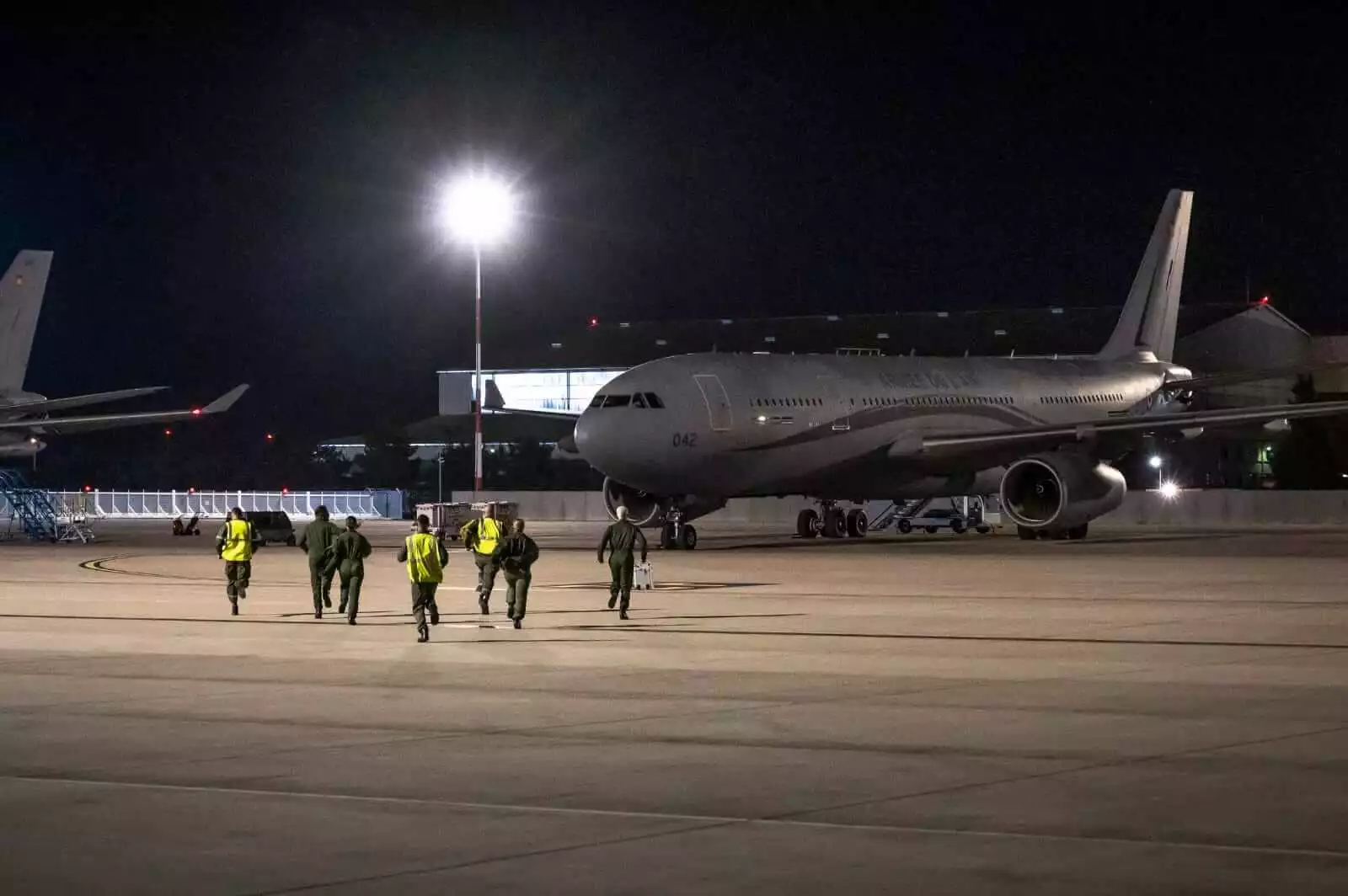 Scramble! Die Besatzungen der A330 MRTT Phénix-Tankflugzeuge eilen im Rahmen der strategischen Übung Poker 2023-01 zu ihren Flugzeugen. © @CEM_AAE