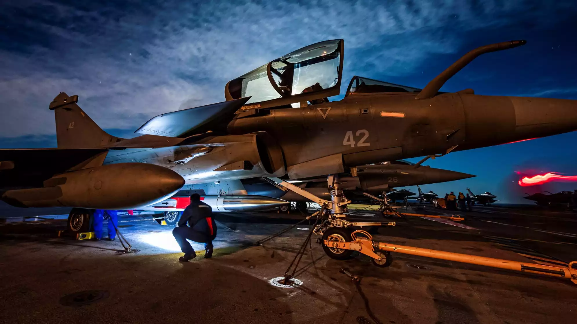 „Diese Kampfflugzeuge können jedoch mit Unterstützung von Tankflugzeugen innerhalb von 48 Stunden überall auf französischem Gebiet eingesetzt werden, ohne dass eine Flugzeugträgergruppe (GAN) erforderlich ist.“