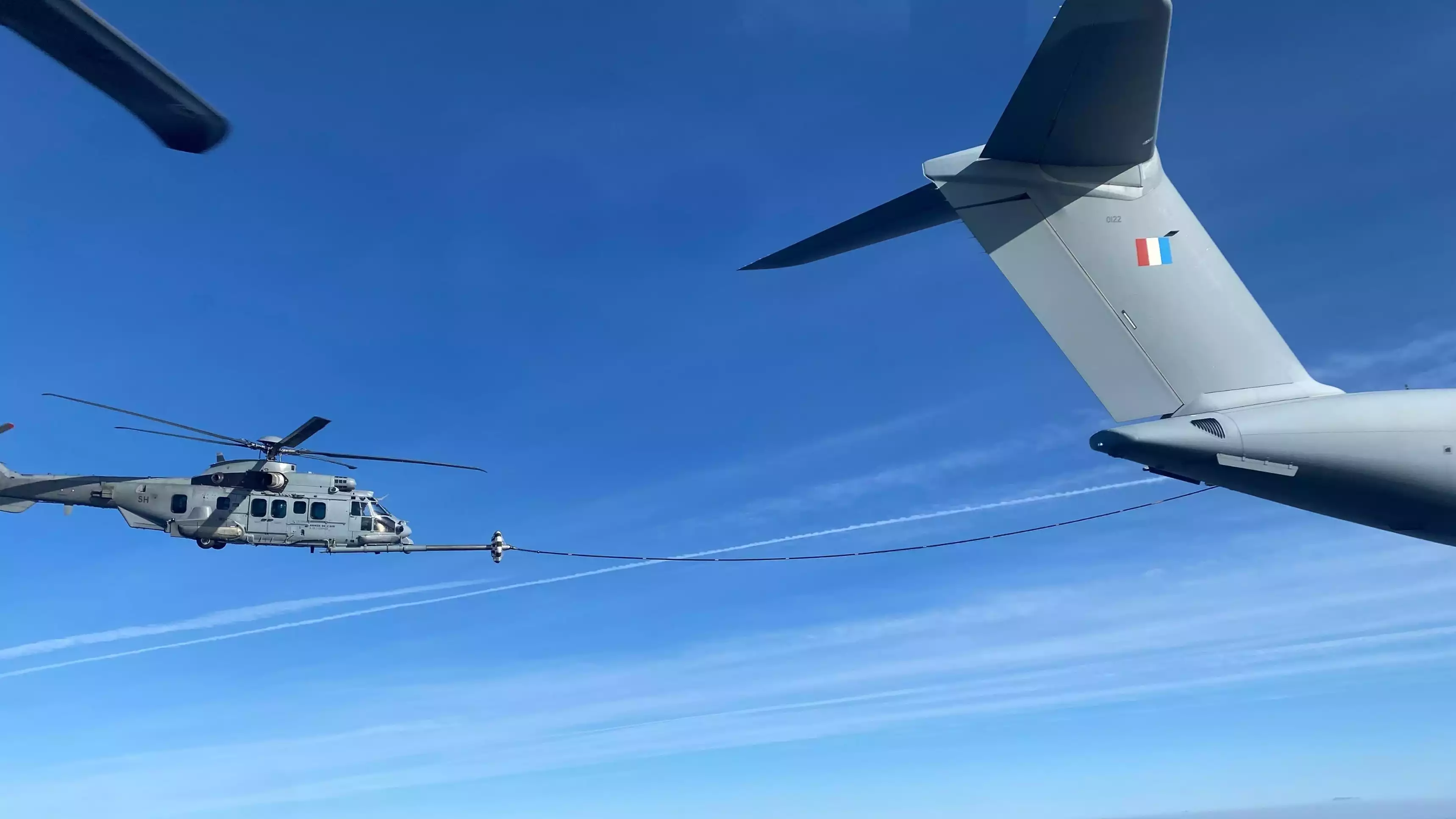Erste Luftbetankung eines Caracal der EH 1/67 Pyrénées durch einen A400M Atlas (ET 3/61 Poitou) der französischen Luftwaffe (5. Februar 2025). © AAE